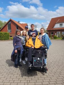 Sonja, en von de, de Tjalf plegt, mellt sik: „Annere hebb dat nich so as he. De laat de Familie, Frünnen un Bekannten na so´n bösen Unfall alleen. Se holt de Behinnerung nich ut.“ Bi uns is dat annners. Wat menst du, wo dull wi tosamen fiern köönt? Tjalf is mittenmank. He maakt den gröttsten Spijökenkraam. De Sünn lacht daröver, wenn se dat süht. Wi sünt nu mit alle Mann hoch dorbi un helpt ünner dat Leid vun Tjalf un sien Fründin Lisa dorbi, dat Huus ümtobun. Dat hebb se köfft. Denn kann Paul mit sien Rullstohl överall hen. Wi seht na de Arbeid swatt as de Nacht ut. Annere liggt denn in de Sünn. An Fieravend krich wi en Putt frische Supp. Den bringt Oma Helga. In de Straat heit se: Mutter Theresa oder Oma Sünnschien. Wi drömt dorvun: Wenn dat all trecht is, maakt wi en Foto. In de Mitt sühst du Tjalf un Lisa, sien Leefste, sien Steern. Rundum staht all de Hülpslüüd. Över de Huusdöör hangt en grootet Schild: Huus Sünnschien. Oma Sünnschien schall de Patin sien.