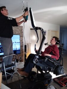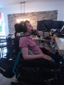 Tjalf smustergrient. Hannes is ut de Tüt: „ Wenn ik Tjalf bemööt, smuustergrient he in sienen Rullstohl. Dat is för mi so, as wenn de Sünn an een swatten Dag dörch de düstern Wulken brekt. Tjalf kann nich af, dat wi em beduert, dat he vun sien Hals af lahm is, sine Hannen un Fööt nich rögen kann un bi Dag un bi Nacht Hülp brukt uk bi´t Luft holen. He gröt Jule. De maakt na een swoore Operaschoon mit ehr Krücken wedder de iersten Schreed. Wi denkt: Dat is Quälkraam. Man se is stolt dorop, dat se dat schafft. Se lacht. Dat schöön Weeder maakt eer Moot, an de frische Luft to gahn. Tjalf kiekt se an: „Jule, dat is bi di so as bi mi. So as ik nu öv, mit en Strohalm ut een Glas to drinken. Dorto helpt mi de Roboterarm, den ik kregen hebb. Ik mutt mi bi allens veel Tied laten. So as du, wenn du mit mi snackst. Ik kann di blot langsam antern.“