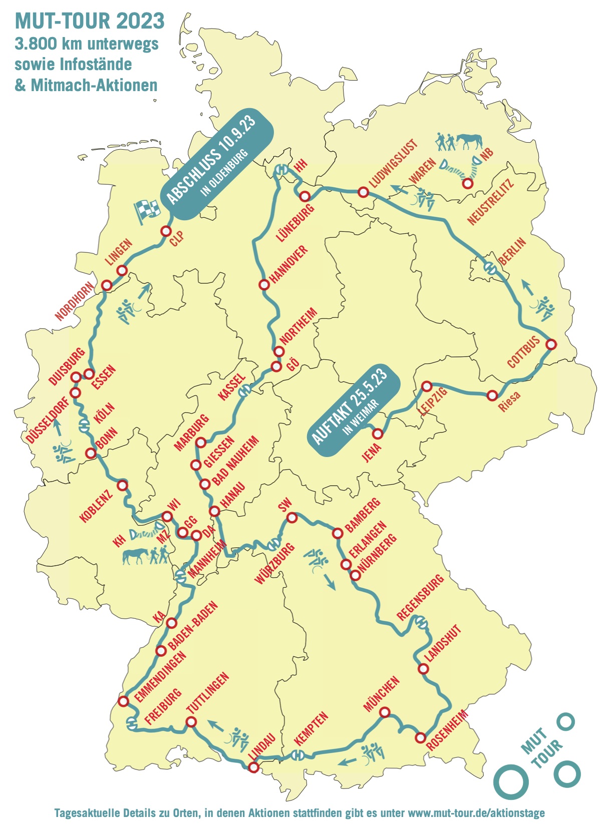 Bereits zum elften Mal bewegen sich diesen Sommer hunderte Menschen mit und ohne Depressionserfahrung im Rahmen der MUT-TOUR durch Deutschland, um ein Zeichen zu setzen für mehr Offenheit, Wissen und Mut im Umgang mit psychischen Erkrankungen. Insgesamt 3,5 Monate werden die Teams vom 25.05. bis 10.09.2023 wieder zu Fuß in Pferdebegleitung sowie auf Fahrrad-Tandems unterwegs sein. In den letzten zehn Jahren konnte die MUT-TOUR jeden Sommer erleben, wie sich durch offene Gespräche Berührungsängste und Vorurteile stetig abbauen lassen. Und auch die Teilnehmenden erfahren – weit über die Dauer der Etappenphase hinaus – ein Gemeinschaftsgefühl, welches sie bis in den Alltag hinein nachhaltig unterstützt. In den täglichen Interviews mit den Medien entlang der Strecke sowie den Gesprächen am Wegesrand berichten die Teilnehmenden von den Erfahrungen mit der eigenen Erkrankung und suchen den offenen Austausch über die Bedürfnisse von sowohl Betroffenen als auch Angehörigen. Auch in diesem Jahr wird es in ausgewählten Städten wieder Aktionstage in Zusammenarbeit mit unseren Partnerorganisationen geben. Neben allen wichtigen Informationen zur Initiative MUT-TOUR sowie dem Trägerverein Mut fördern e.V., stellen dort ortsansässige Vereine auch die eigenen Hilfsangebote vor. Zusätzlich organisiert die MUT-TOUR an mehreren Orten Mitmach-Aktionen, die es möglich machen, die jeweiligen Etappenteams auf dem eigenen Fahrrad beziehungsweise zu Fuß, für einen kleinen Teil des Weges zu begleiten. Mit niedrigschwelligen Angeboten, wie den Bewegungsspenden und der Mut-Schnipseljagd, lässt die MUT-TOUR auch diejenigen teilhaben, für die es nicht möglich ist, persönlich dabei zu sein. Zusätzlich bietet der MUT-ATLAS eine umfangreiche Online-Übersicht psychosozialer und medizinischer Angebote vor Ort in ganz Deutschland. Gemeinsam erreichen wir viele! Die MUT-TOUR 2023 wird finanziert durch DAK, BARMER, Deutsche Rentenversicherung, Landschaftsverband Rheinland (LVR), Kaempgen-Stiftung, VINCIStiftung und Aktion Mensch. Mit der Deutschen DepressionsLiga e.V., Stiftung Deutsche Depressionshilfe, dem Bundesverband der Angehörigen psychisch erkrankter Menschen e.V., dem ADFC e.V., Deutsches Bündnis gegen Depression sowie der Deutsche Angst-Selbsthilfe e.V. arbeitet die MUT-TOUR partnerschaftlich zusammen.