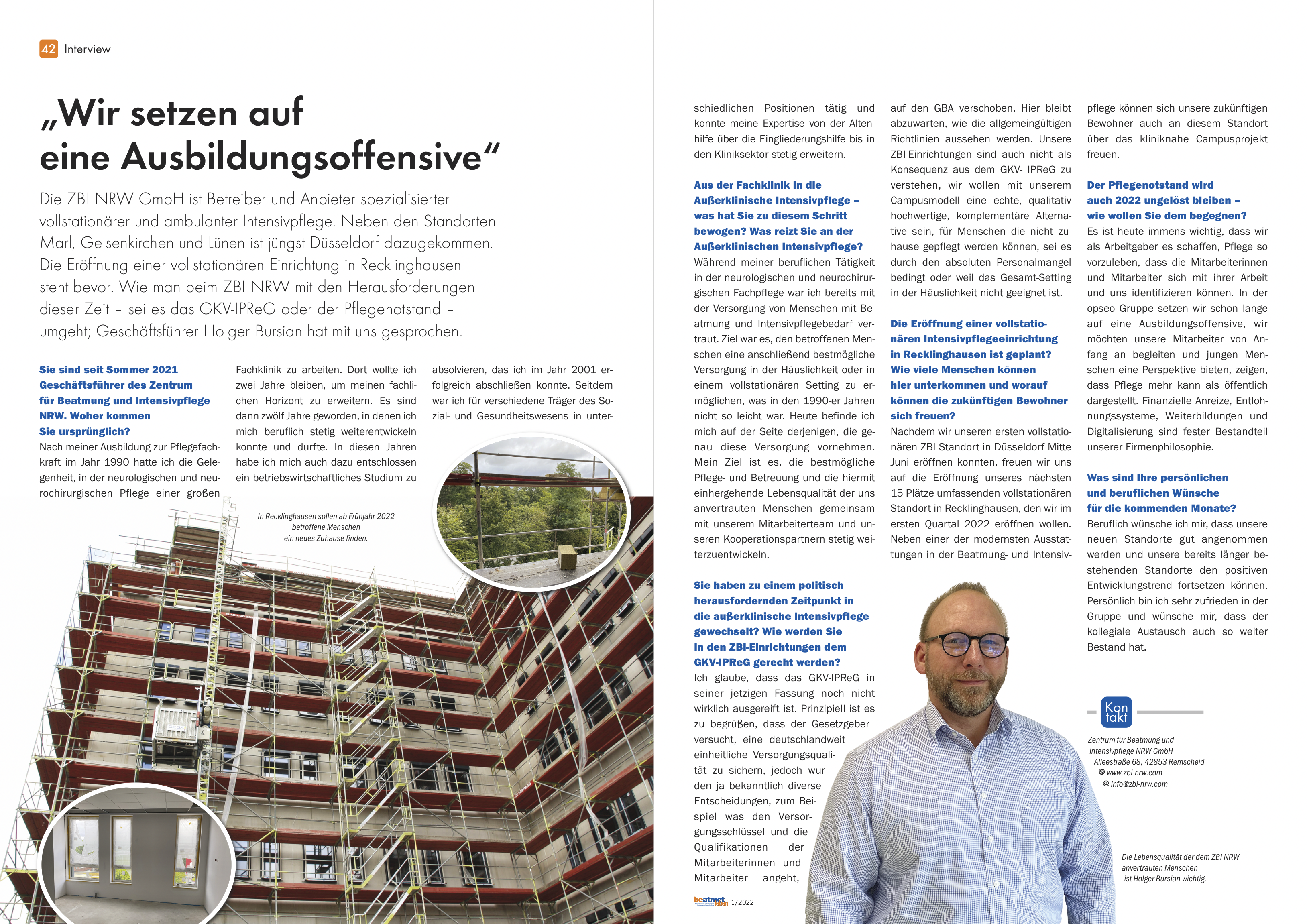 In der ersten Ausgabe 2022 der Fachzeitschrift beatmetleben haben wir mit Holger Bursian, Geschäftsführer des ZBI NRW gesprochen; er hat uns gesagt, welche Wege er gehen möchte, um die Herausforderungen rund um die außerklinische Intensivpflege zu bewältigen.
